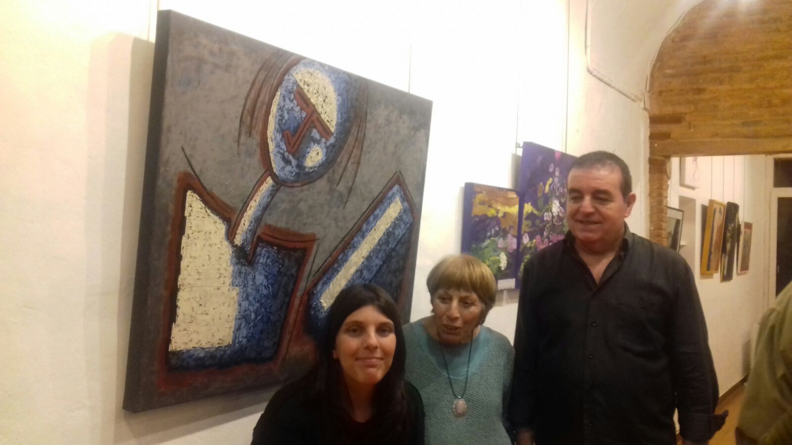 En la foto se puede observar al pintor junto a Lina Cucchetti i Sabrina Tenas, al lado de la obra expuesta por el artista.